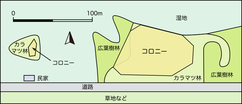 1993年11月15日の調査では、営巣木75本に75巣を確認している。また、1992年11月23日の調査では、カラマツ30本に30巣を確認している。1992年当時の営巣面積は約1,000m2である。